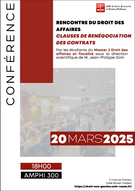 « Depuis la rentrée de l’année universitaire 2015-2016, nous avons l’honneur de succéder à notre collègue et ami, le Professeur Emmanuel Kornprobst, à la direction du Master 2 Droit des affaires et fiscalité de la Faculté de droit de Rouen.